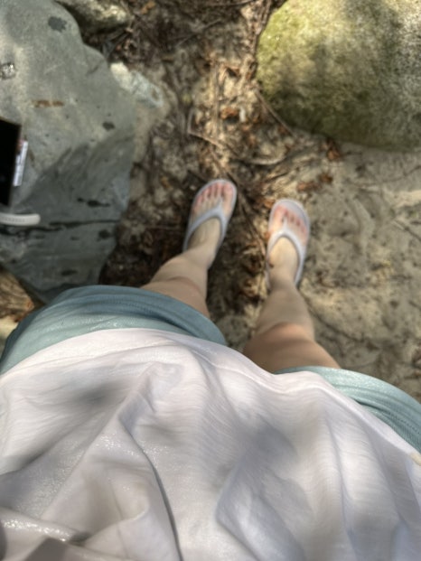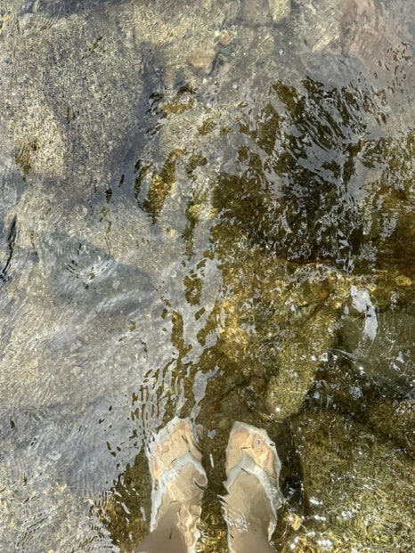 신발에 모래가 들어가서 돌에 쪼그려 앉아서는 신발을 물에 씻어내고 있었어요..