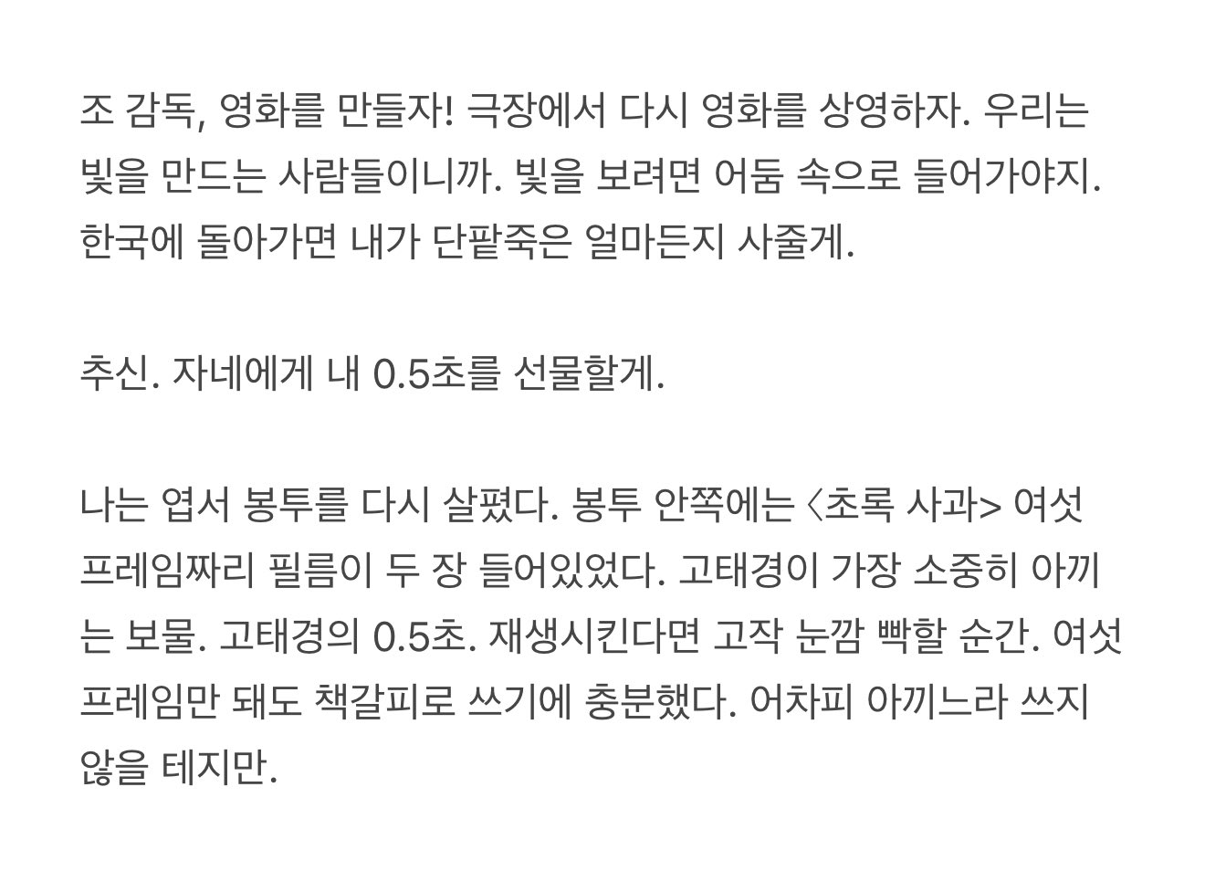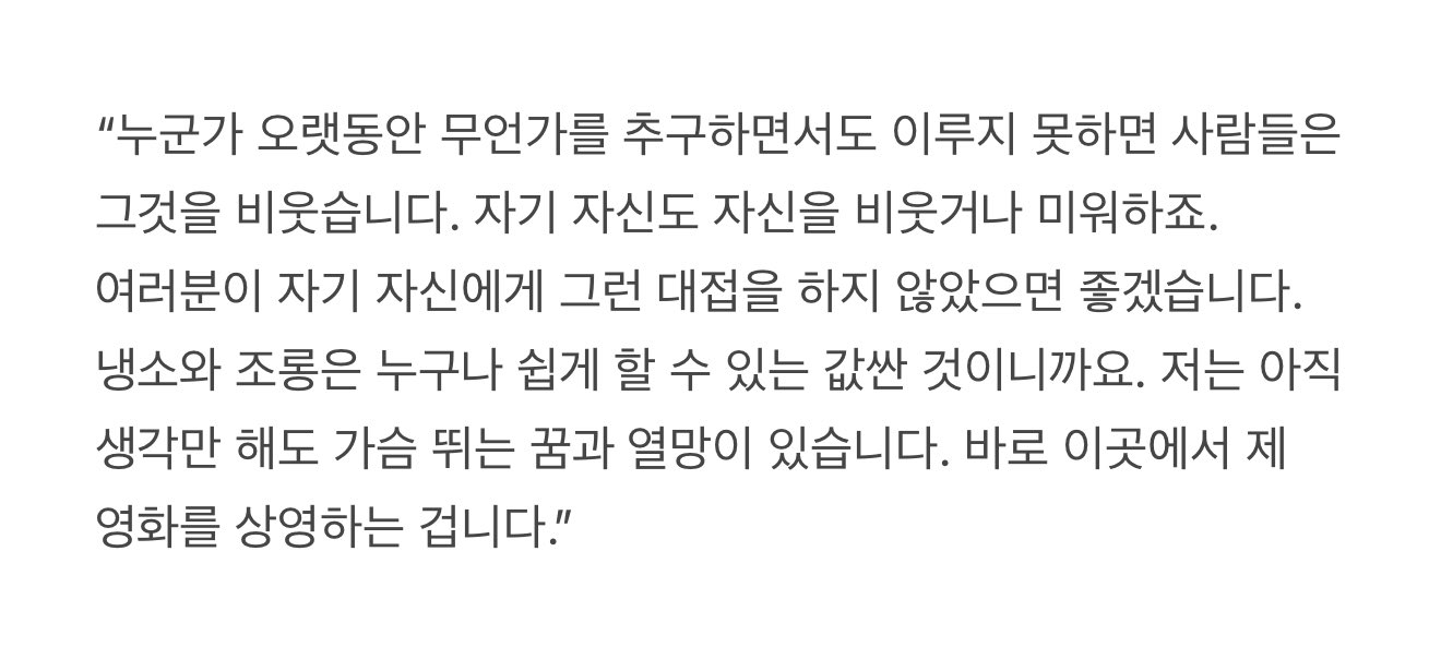 “영화는 내게 좋은 것만 줬는데. 영화가 나한테 상처를 준 게 아닌데. 영화가 미워지고 극장도 안 가게 되더라. 영화도 밉고 나도 밉고...... 나, 그저 영화가 좋아서 그다음은 생각도 않고 영화학교에 갔어. 돌아보면 난 그다지 감독이 되고 싶지도 않았어. 꼭 감독이 돼야 하는 거 아니잖아? 그게 행복의 척도도 아니고.”
