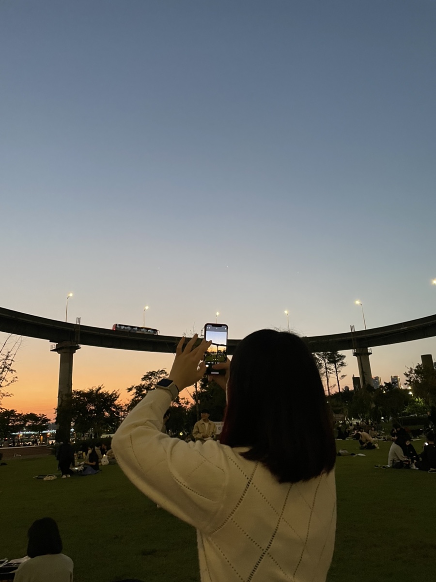 택시 타고 한강으로 가는 중인데 햇빛에 비친 머리 색이 마음에 든다고 김제하가 사진 찍어줌